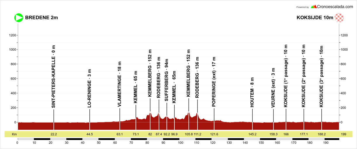 Bredene, commune limitrophe d'Otsende, accueille le départ puis la course se dirigera vers le sud et les monts du Heuvelland, tout près de la frontière française. Au km 73, une petite boucle que l'on empruntera cette année à deux reprises franchit le Monteberg qui donne accès au célèbre pavé du Mont-Kemmel, puis grimpe le Rodeberg.