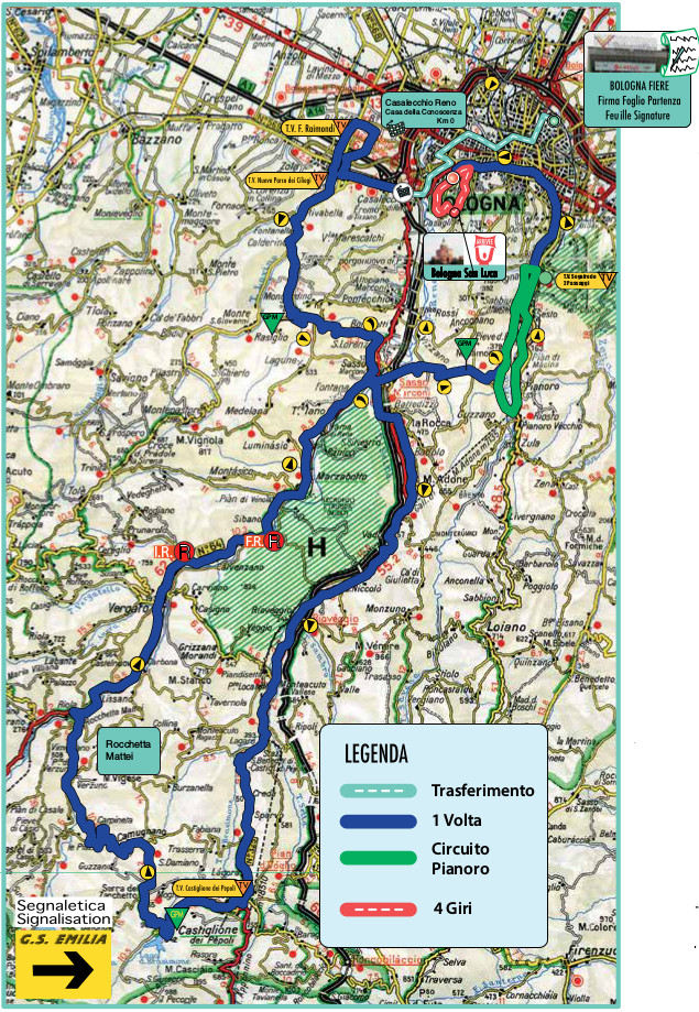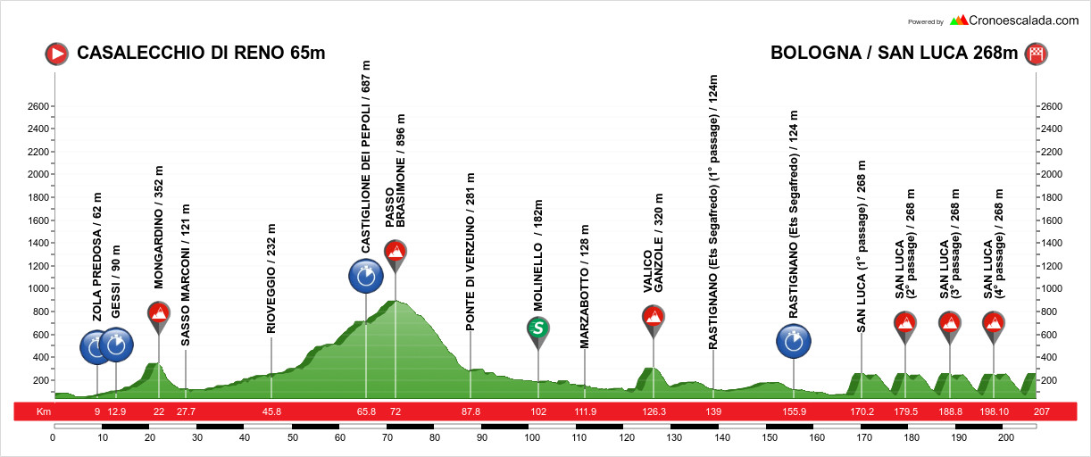 Au km 133, les coureurs s'infuseront la "boucle Segafredo" puis ce sera Bologne et à partir du km 168 les cinq tours du circuit de 9,3 km et cette ascension vers le Colle della Guardia au pied de la basilique San Luca : 2,1 km à 10 % de moyenne avec deux points forts : le pied de la montée (14 % sur 500 mètres) et le fameux double virage à mi-montée où l'on atteint un passage à 16 % ; la pente s'adoucit un peu sur la fin. .