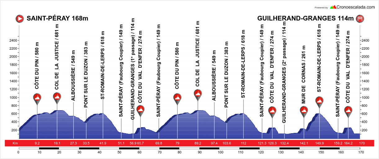 Toujours est-il que le tracé est clairement typé grimpeurs avec deux premières boucles presque identiques (boucle 1 en jaune, boucle 2 en vert) grimpant jusqu'au col de la Justice puis à Saint-Romain-de-Lerps, et une troisième (en bleu) suivant les coteaux du Rhône avant de monter le Mur de Cornas (AOC), ou côte de la Carrière pour les indigènes, puis de nouveau à Saint-Romain-de-Lerps par un chemin plus escarpé. Entre chaque boucle et sur le final revient, lancinant, le Val d'Enfer (1,7 km à 9,3 %) qui, posé à 6 kilomètres de la ligne d'arrivée, joue un rôle important quant à l'issue de la course.