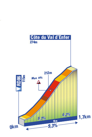 Le tracé s'est stabilisé au fil des années et sera identique à celui de l'an dernier : sélectif, musclé et favorable plutôt aux grimpeurs en raison de la multiplication des ascensions et des 3100 mètres de D+ annoncés (et confirmés). La fin de parcours est bien dessinée et plutôt gratinée avec ce fameux Val d'Enfer, gravi au total à trois reprises dont la dernière à seulement 6 kilomètres de la ligne d'arrivée : c'est souvent là que se départagent ceux qui ont survécu à la belle collection d'ascensions de la journée.