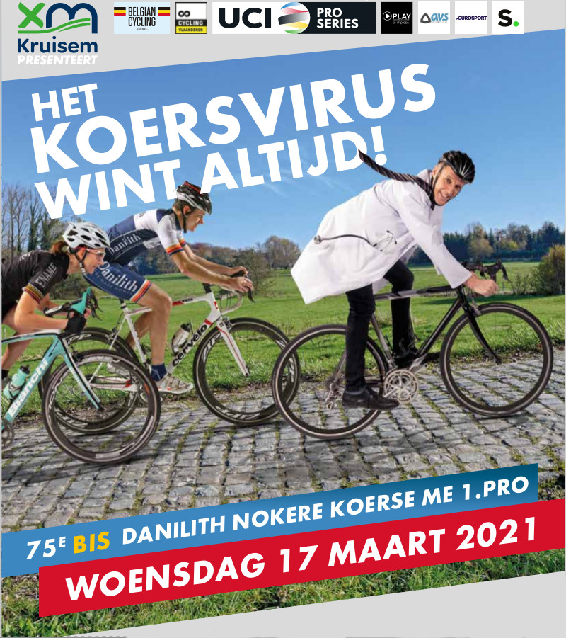 Le parcours 2021 a été tracé dans le même esprit que ces dernières années : une liaison de 73 kilomètres depuis le départ à Deinze suivi de quatre tours d'un circuit de 30,5 km. Le Nokereberg aura été franchi au total cinq fois - plutôt moins qu'habituellement - et accueillera bien sûr la ligne d'arrivée. Le village ne pourra toutefois baigner dans l'ambiance de fête qui caractérise habituellement le jour de la Nokere Koerse : celle-ci se déroulera évidemment à huis-clos. Même l'affiche de la course s'est mise au goût du jour (façon de parler !) en rendant hommage au personnel de santé et avec la légende : "le virus de la course l'emporte toujours".