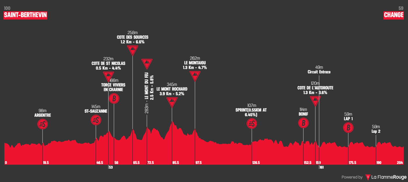 Tracée entre Saint-Berthevin et Changé sur une distance de 183 kilomètres, la 1ère étape des Boucles de la Mayenne devrait normalement convenir à un sprinter. Attention toutefois à une petite bosse présente dans le final, et qui pourrait donner quelques envies aux attaquants.
