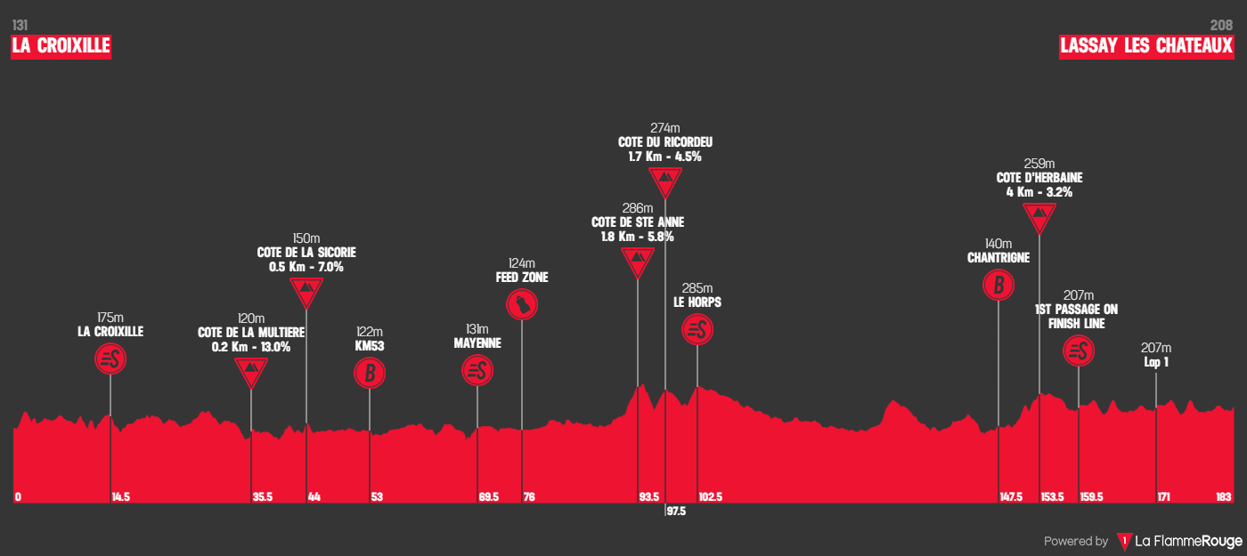Tracée entre La Croixille et Lassay-les-Châteaux sur une distance de 179 kilomètres, la 2ème étape des Boucles de la Mayenne est certainement la plus compliquée de cette édition 2019, et l'arrivée dans la cité fortifiée mayennaise devrait sourire à un homme fort. Attention également aux possibles défaillances, car même si la météo s'annonce meilleure que vendredi, la 1ère étape disputée dans des conditions dantesques a forcément laissé des traces dans les organismes des coureurs.