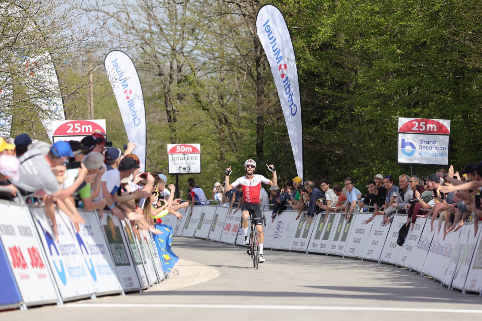 Dans le dernier kilomètre, Alexis Vuillermoz fait figure d’épouvantail mais sa dernière attaque dans les ruelles ensorcelantes du village de Montfaucon ne distance personne. Elle permet même à Jesùs Herrada, discret au possible jusqu’ici, de placer un contre. Une attaque incisive qui cloue ses collègues d’échappée sur place. Tous sauf un, Victor Lafay, qui prendra le sillage de son coéquipier pour s’adjuger la deuxième place.