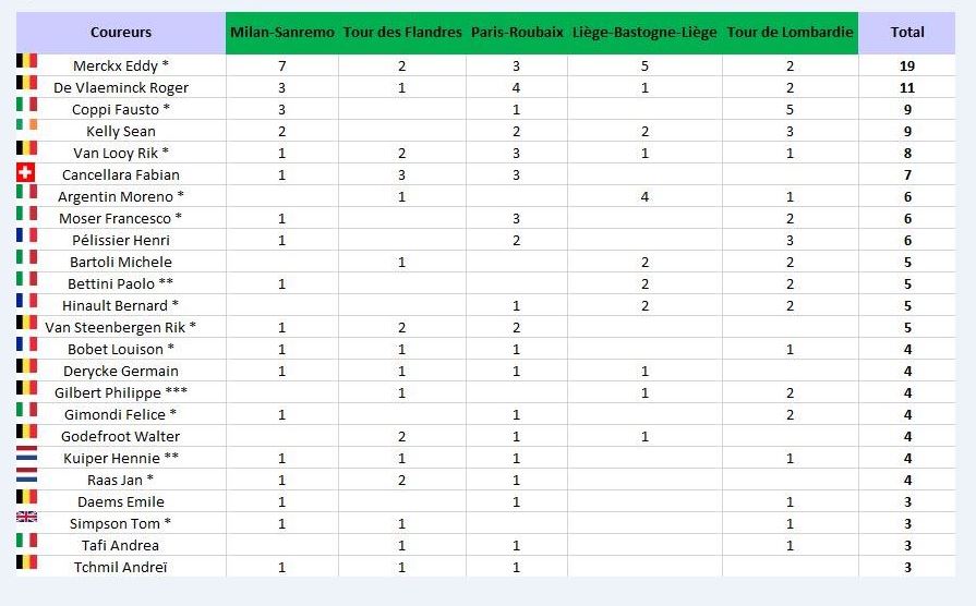 Malgré des épreuves centenaires, seuls 24 coureurs, à ce jour, ont réussi cette performance et à peine 3 coureurs sont parvenus durant leur carrière à remporter au moins 1 fois les 5 épreuves. Il s’agit d’ailleurs des 3 grands champions belges ; Rik Van Looy, Roger de Vlaeminck et bien entendu Eddy Merckx. «Le Cannibale» possédant même à son actif la bagatelle de 19 victoires dans les grands monuments.