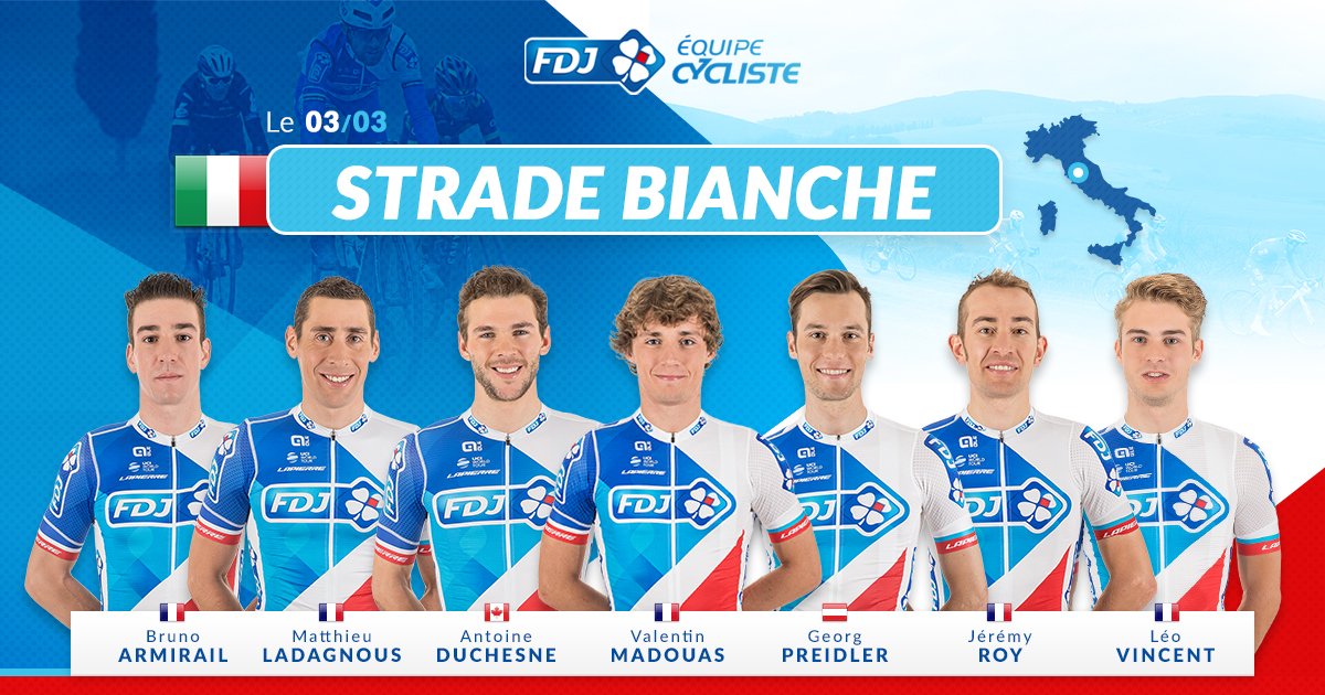 En l'absence de ses leaders, Arnaud Démare et Thibaut Pinot, l'équipe FDJ présentera une équipe fortement rajeunie au départ de la désormais célèbre épreuve italienne, les Strade Bianche. Si Jérémy Roy et Mathieu Ladagnous viendront en effet apporter toute leur expérience, on retrouvera à leurs côtés, 2 néo-pros, Valentin Madouas et Bruno Armirail, ainsi que Léo Vincent, passé lui professionnel en 2017.