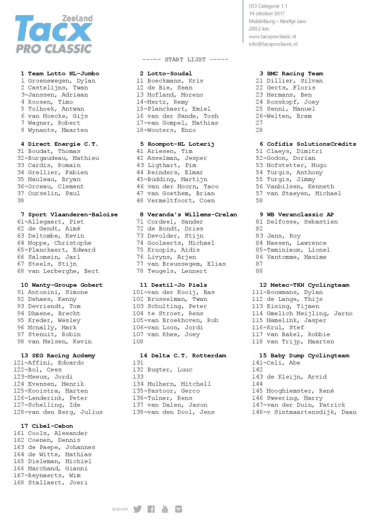 Start-List de la Tacx Pro Classic 2017