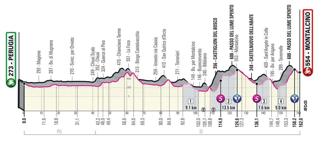 C'est certainement l'étape la plus attendue de ce Tour d'Italie 2021. Et pour cause, celle-ci empruntera pas moins de 35 kilomètres de chemins de terre, rendus célèbres par les Strade Bianche. Et si l'on rajoute à cela un final accidenté, le spectacle sera forcément au rendez-vous entre Pérouse et Montalcino.