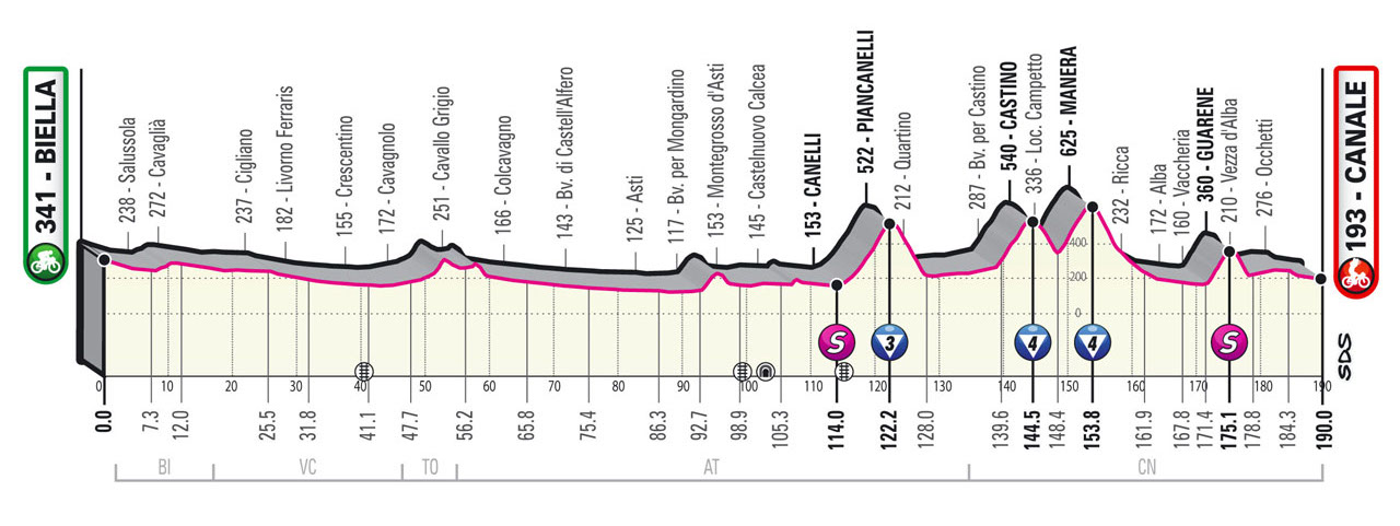 Tracée entre Biella et Canale sur une distance de 190 kilomètres, la 3ème étape du Tour d'Italie s'annonce difficile à lire. En effet si les difficultés ne semblent pas insurmontables, celles-ci sont néanmoins assez nombreuses et proches de l'arrivée pour éliminer la plupart des sprinters. Reste donc à savoir si l'on assistera à un sprint en comité réduit ou à la victoire d'un échappé.
