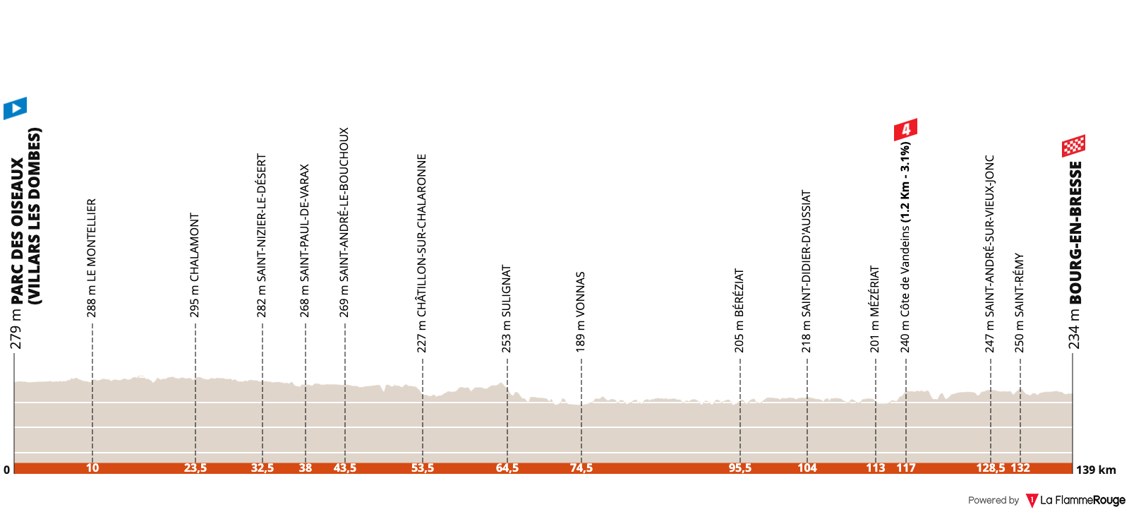 Tracée entre le Parc des Oiseaux et Bourg en Bresse sur une distance de 141 kilomètres, la 1ère étape du Tour de l'Ain s'annonce promise à un sprinter. Aucune difficulté n'étant présente tout au long du parcours, on voit mal comment la victoire pourrait échapper à un homme rapide dans la dernière ligne droite.