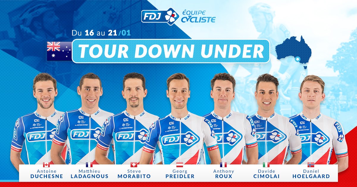 La FDJ a annoncé les noms des deux derniers coureurs qui compléteront son équipe en vue du Tour Down Under. Et pour accompagner Anthony Roux et Steve Morabito notamment, ce sont Mathieu Ladagnous et Davide Cimolai qui ont été choisis par le staff de la formation française.