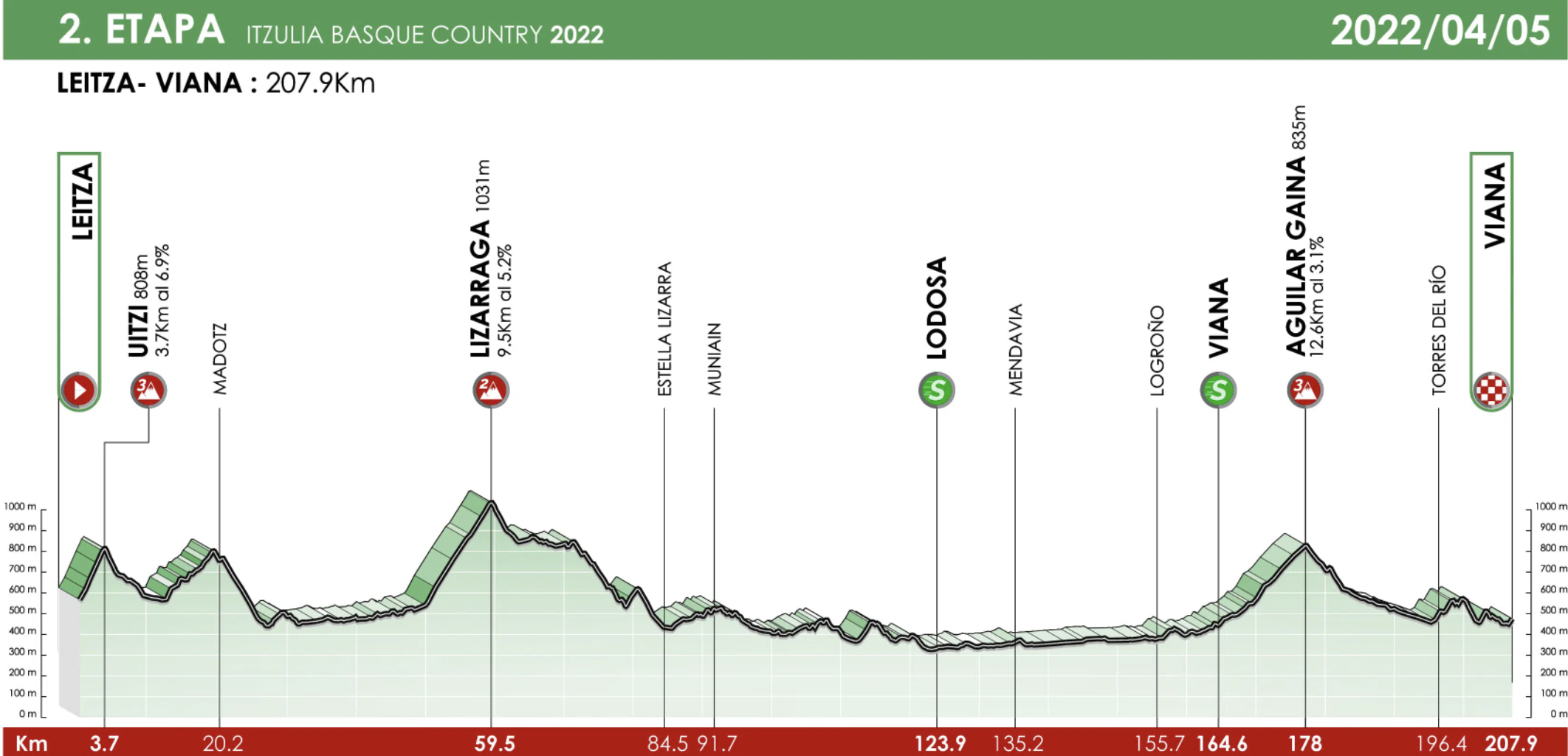 Tracée entre Leitza et Viana sur une distance de pas moins de 207 kilomètres, la 2ème étape du Tour du Pays Basque devrait déjà sourire à un homme fort, car même si les difficultés du jour ne paraissent pas insurmontables, la distance, mais aussi les conditions météo pourraient rendre la course difficile.