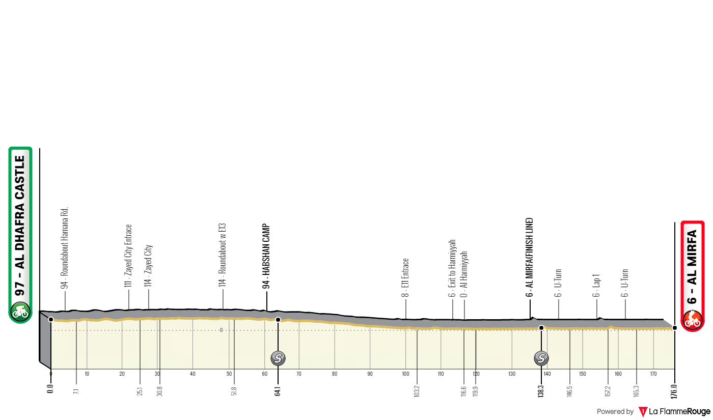 Tracée entre Al Dhafra Castle et Al Mirfa sur une distance de 176 kilomètres, la 1ère étape de l'UAE Tour s'annonce promise à un sprinter puisque aucune difficulté n'est présente tout au long du parcours proposé aux coureurs.