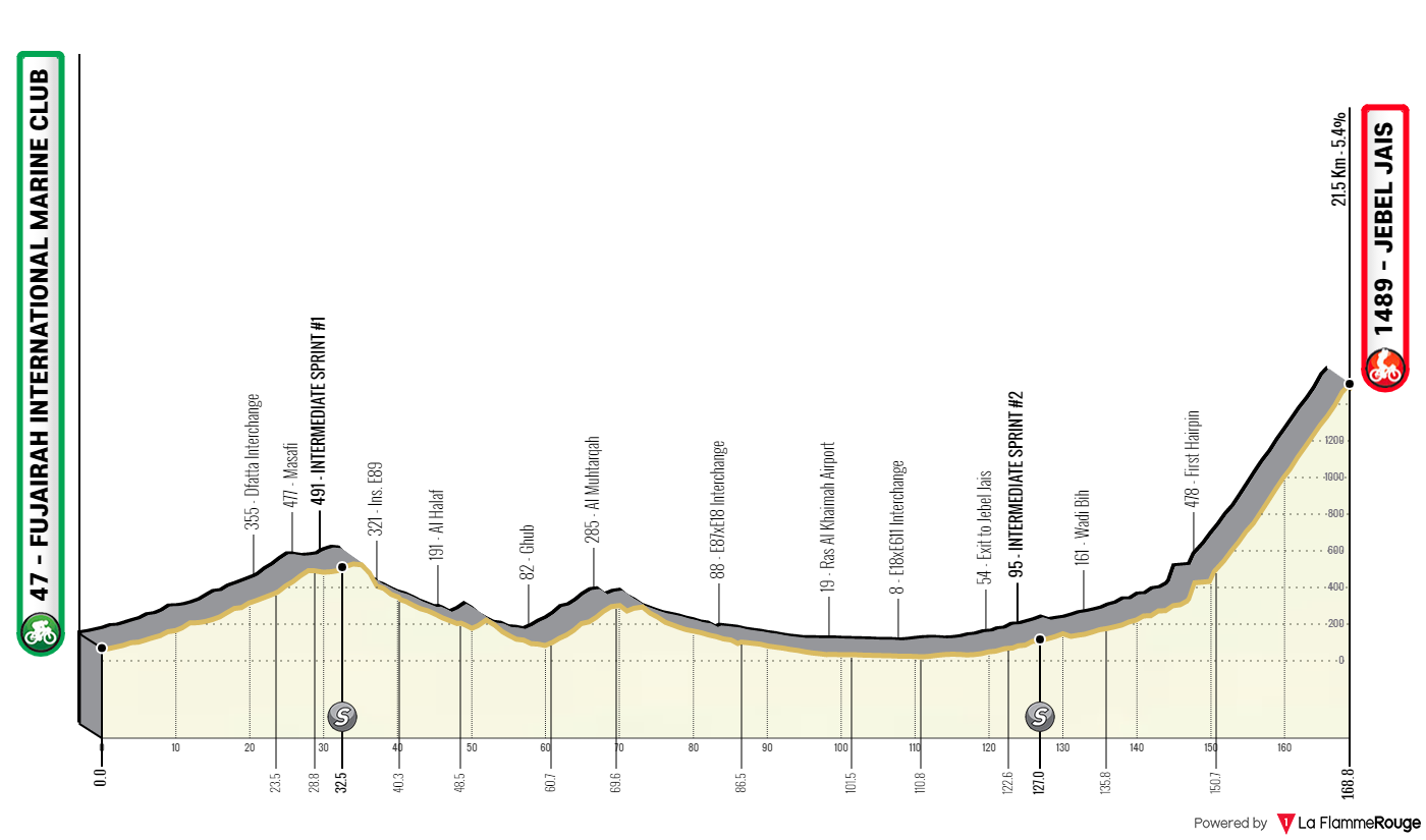 Tracée entre Fujairah Marine Club et Jebel Jais sur une distance de 170 kilomètres, la 5ème étape de l'UAE Tour s'annonce compliquée puisque l'arrivée sera jugée au sommet d'une ascension d'environ 20 kilomètres, présentant une pente moyenne d'un peu plus de 5%. Certainement insuffisant toutefois pour créer de gros écarts entre les candidats à la victoire finale, et sauf défaillance, on voit mal comment Pogacar pourrait perdre son maillot de leader.